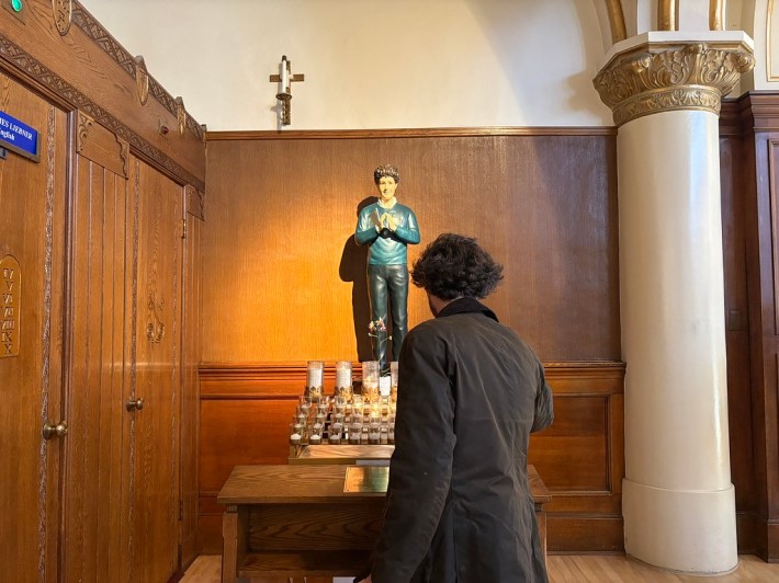 Alex Shortt rose from his pew, walked down the nave to the back corner of the church, and kneeled at the shrine of St. Carlo Acutis.