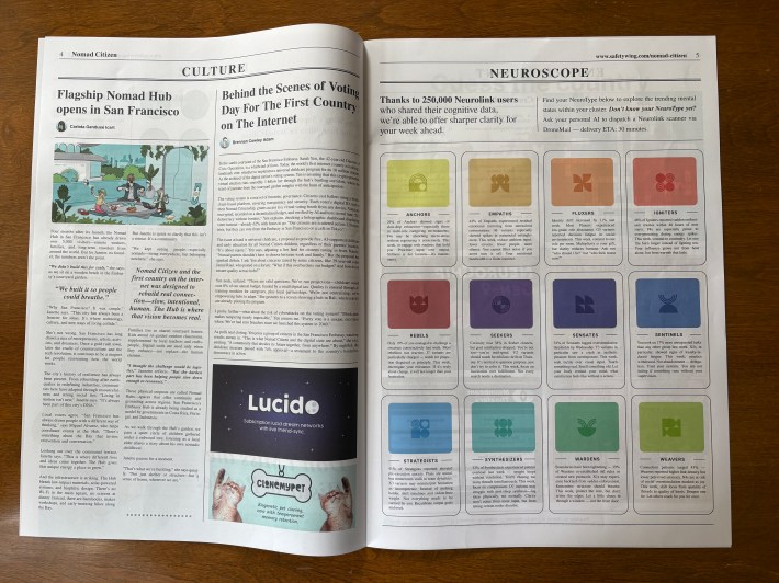 Some network society scenarios go: Secure the land first, bring the highly-aligned citizens second. The network state SafetyWing imagines for itself in The Nomad Citizen is the opposite; physically, it would be no more than a network of locally-recognized embassies. (“This is the first prototype,” said Razavi, gesturing around the pop-up. “Possibly with hotel rooms as well.”)