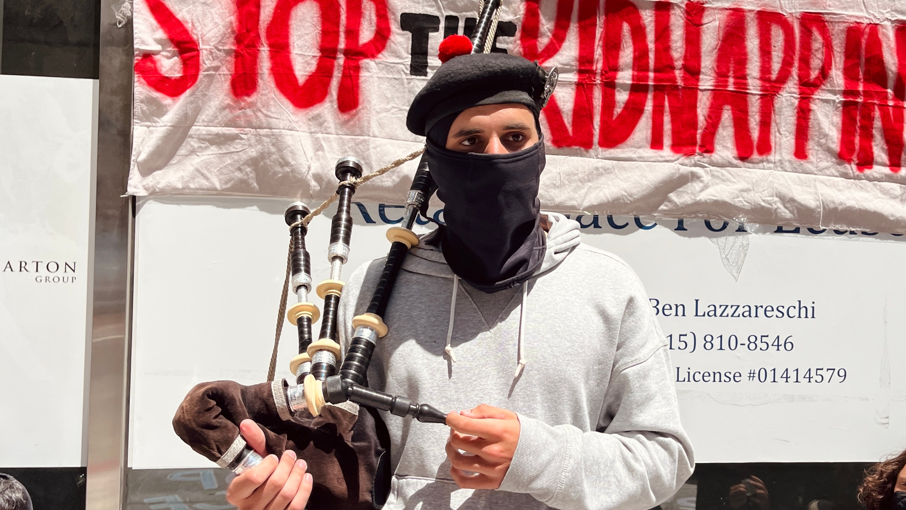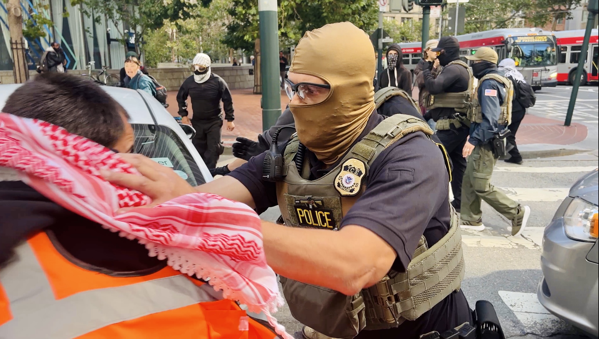 On Wednesday, I watched a few enforcement agents show a milder approach, keeping protesters at bay with an outstretched hand or using their bodies to block attempts to stop federal vehicles from leaving the scene near 100 Montgomery St. Still, more agents seemed intent on cracking down, especially against protesters who confronted them verbally in the streets. I watched multiple people get tackled and struck in the head and neck area; one young man near me was pinned against a parked car by an ICE agent, who grabbed him by the collar and threatened to cuff him.