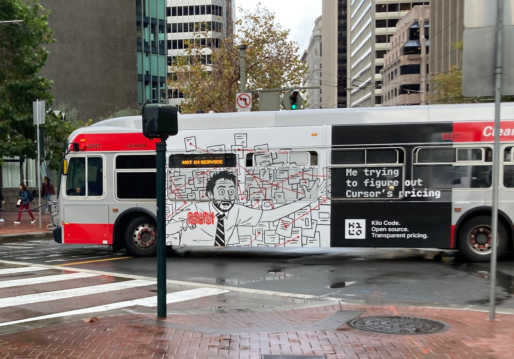 Have you seen those Kilo Code AI ads around San Francisco, the ones with the cartoon version of Charlie Day from the iconic “Pepe Silvia” scene in It’s Always Sunny in Philadelphia? Sure you have: The ad, much like the meme, features a bug-eyed man in a short-sleeved shirt and striped tie frantically gesturing to a cluttered mind map tacked to the wall behind him, next to a meme-y slogan that calls out a competitor: “Me trying to figure out Cursor’s pricing.” This image is plastered on billboards, buses, and bus stops all over the city.