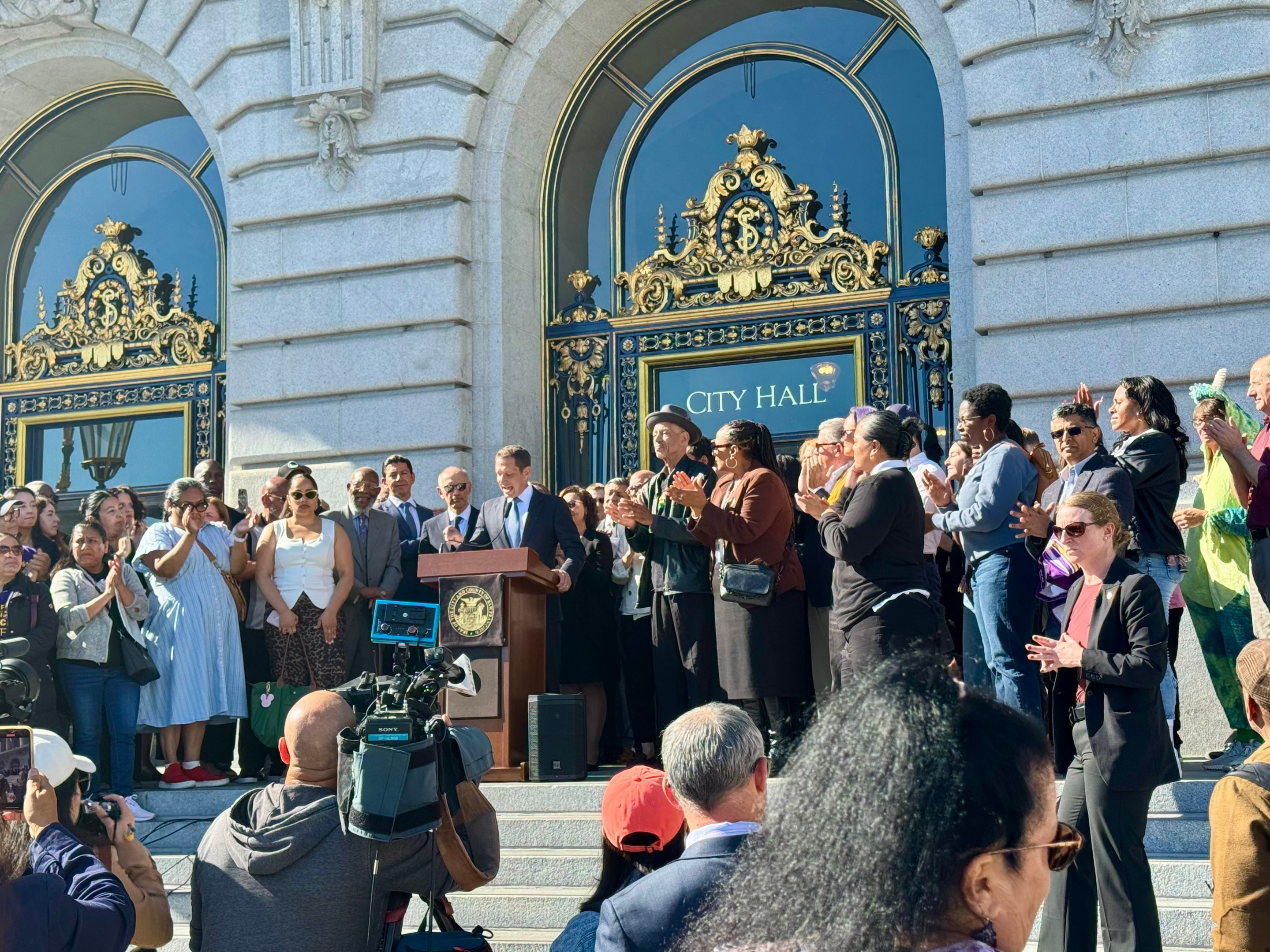 The mayor announced the initiative on the steps of City Hall, flanked by two dozen people including members of the Board of Supervisors, the Human Services Agency, Self-Help for the Elderly, the San Francisco Interfaith Council, and others.