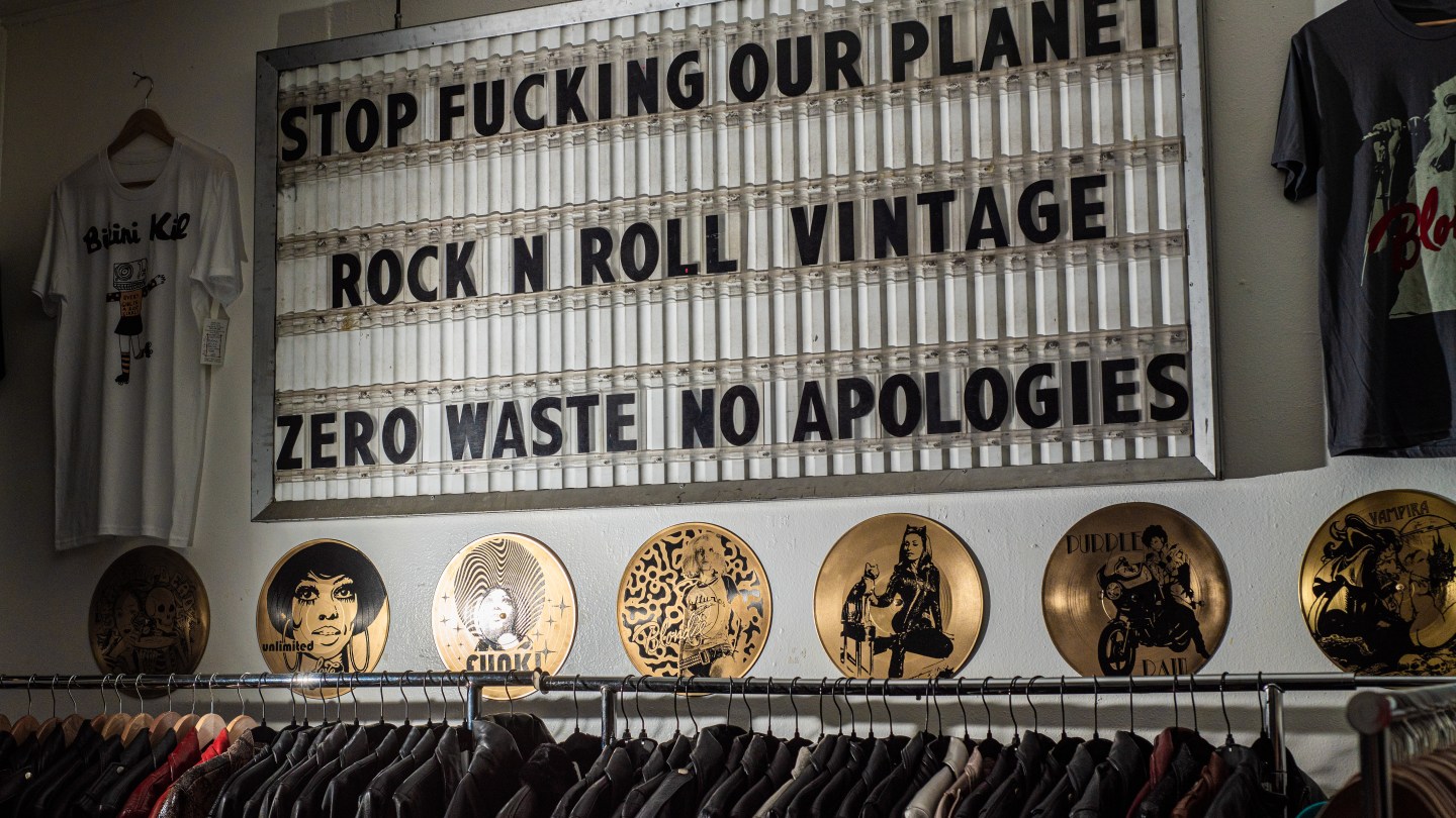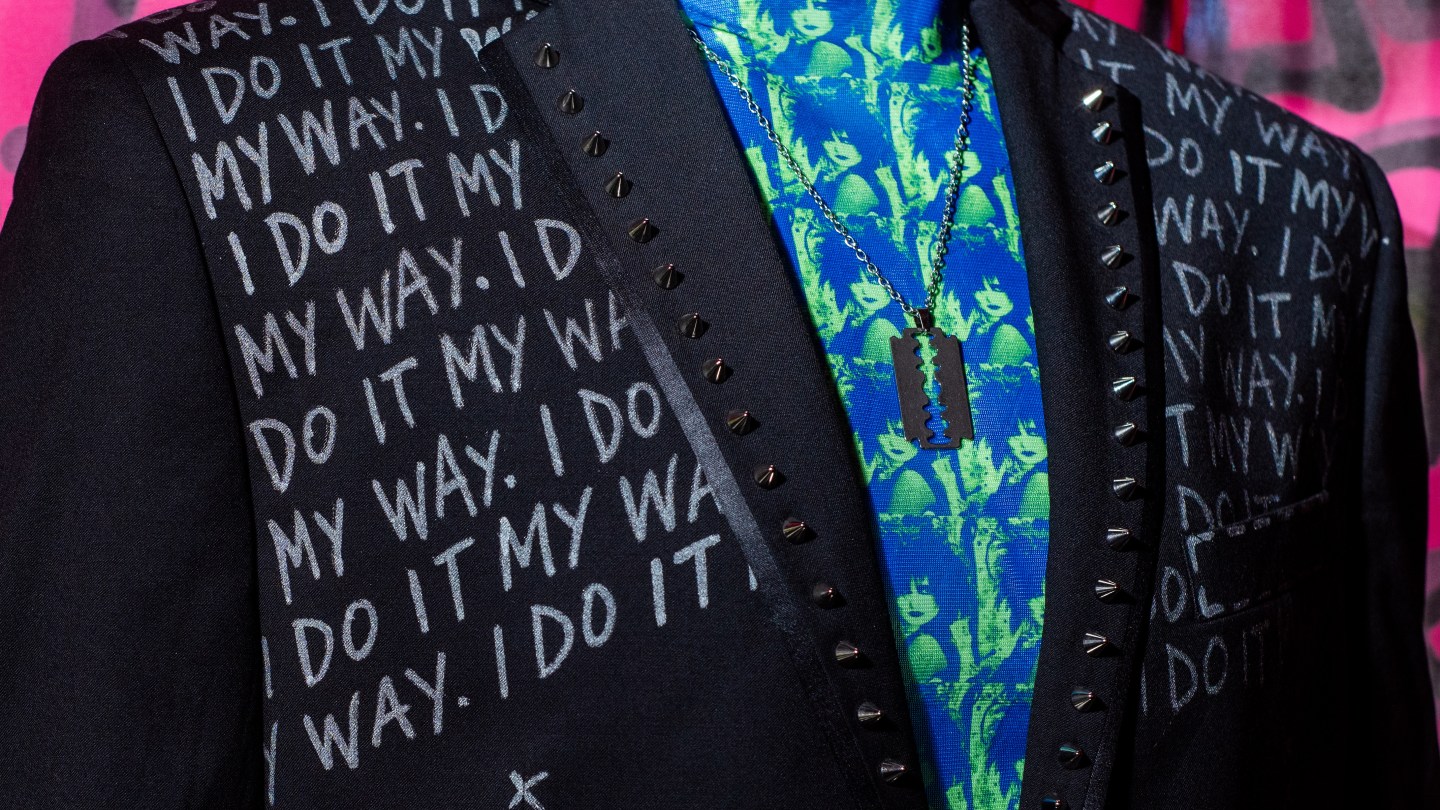 While she may not be in a band, Amnesia could style one with her one-of-a-kind of pieces. Punk Majesty specializes in vintage items that have been altered and embellished by Amnesia with stitches, studs, safety pins, and handwritten messages like DO MORE THAN EXIST, THE FUTURE IS UNKNOWN, and I DO IT MY WAY. (Amnesia leans towards positive messages, noting that her father was a motivational speaker.)