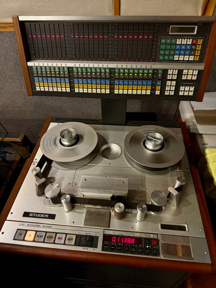 At the Tape Vault, von Sneidern records on a 2-inch, 24-track tape recorder at 30, 15 or 7.5 inches per second. Dolby SR can be used to improve the dynamic range of the recording. Clients can also record on a commanding Studer A820 24-track recorder, a machine about the size of a washer, that was considered the zenith of analog tape recording in its day. It cost as much as a single family home when it was sold to recording professionals in the ’80s.