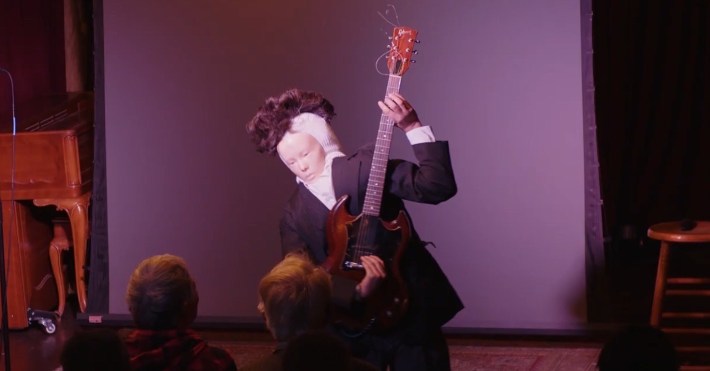 It’s a 2 p.m. show, but I think we have around 45 people coming. Our guest performers are Sara Benincasa, Kyle Ayers, Jared Kassebaum, and Iain Langlands, each of whom has some slide show component to their bits. We often joke that our show is like a homework assignment that even we put off till the last minute. My cohosts Land Smith, Aviva Siegel, and Nick Stargu, have backlogged a good amount of bits that work for the format of the show and I feel ready despite my earlier dread while watching the news. My thing lately is putting all my clothes on backwards and having a weird face on the back of my head and playing guitar backwards. I have to remind myself that even with a ski mask covering my face, I can’t get too close to the audience or I risk blindly winging someone in the head with the stock of the guitar. I don’t know why people like it — is it clown comedy or a punk rocker’s midlife crisis? — but it’s the thing people have been asking me to do the most.