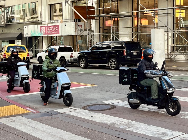 I first noticed an HMP e-moped months ago meandering around the Financial District in February. Turns out, there’s hundreds of these bikes flocking around San Francisco, increasingly favored by delivery drivers who need to shuttle food to hundreds of customers a day at breakneck pace.