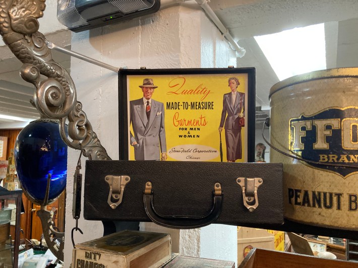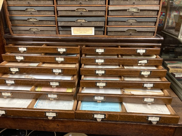 Owner Mark Sackett claims his collection is the largest antique advertising and ephemera store in the world, and looking around, it’s hard to doubt him. The material dates from around 1600 to the 1980s, with 85 countries represented and prices ranging from 25 cents to north of $8,000. The space is lined with tall cabinets and fronted by shorter glass cabinets; it’s organized, immaculate and entirely devoid of any jumble or must of some antique stores.