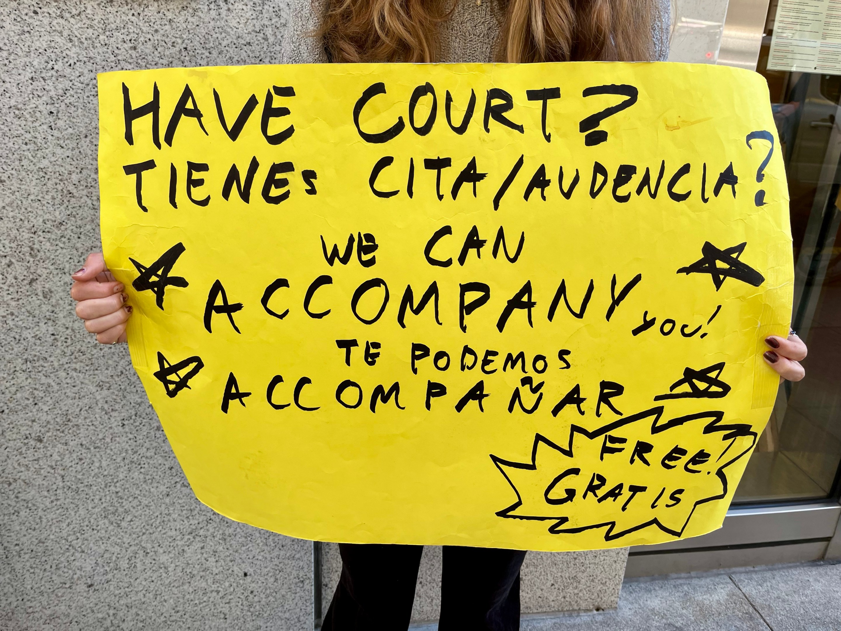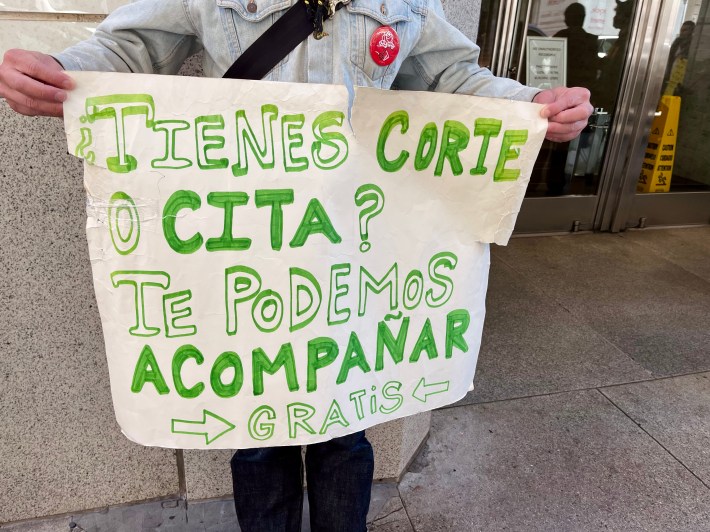 It was the volunteers flanking the doors of 100 Montgomery St., however, who attracted the most attention as they waved colorful signs scrawled with text. One neon yellow sign read: “Have court? Tienes cita/audencia? We can accompany you! Te podemos acompañar — Free! Gratis!”