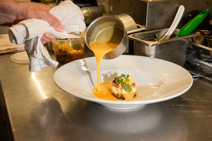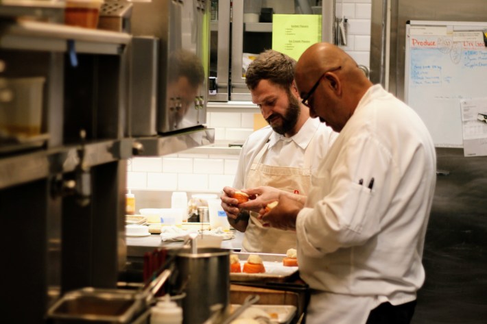 Two cooks chatted while sculpting little crowns of horseradish onto cylinders of gleaming salmon. Another was hunched over petite bowls of buttery corn soup, dotting them with red pickled peppers. A pair of cooks in the center of the kitchen juggled hot pans of sauteéd goods, while a stout man off to the side seared off a row of plump steaks.