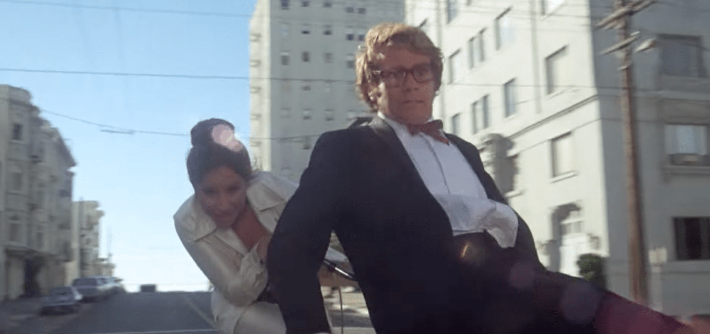 Most of the screwball comedy takes place inside the Union Square Hilton, which was recreated on Warner Bros. soundstages in Los Angeles. Cinematographer László Kovács doesn’t turn the camera on San Francisco until O’Neal (absent-minded but suspiciously buff musicologist Howard Bannister) steps off an errant elevator and finds himself stranded on the hotel’s unfinished 46th floor sky bar with Streisand (chaos agent Judy Maxwell) napping on a grand piano.